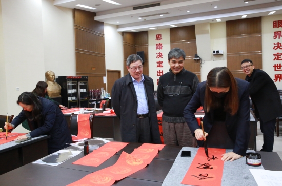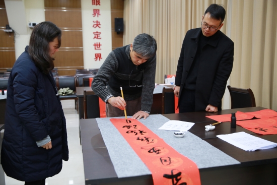 臺(tái)州高速集團(tuán)開展“寫春聯(lián)、送祝?!被顒?dòng)   春節(jié)將至,臺(tái)州高速集團(tuán)開展以“迎新春、送祝福”為主題的寫春聯(lián)、送春聯(lián)活動(dòng),并邀請(qǐng)書法老師到場(chǎng)指導(dǎo)。來自集團(tuán)各部室、所、子公司的書法愛好者紛紛前來參與,集團(tuán)董事長(zhǎng)、總經(jīng)理陳文波到場(chǎng)觀摩。