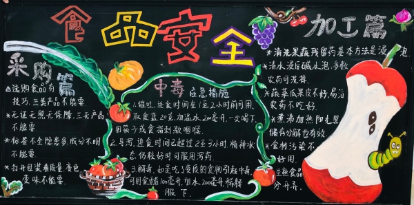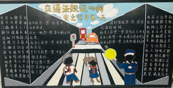 活動前期,臨海南收費所臨時組建五人板報小分隊,充分利用空余時間搜集有關(guān)安全教育資料,對內(nèi)容、畫面進行認真整理、篩選。最終決定三個板塊,以提高安全教育為目的,以不同風格主題來呈現(xiàn),從多方面、多角度設計與繪制,達到了更好的安全教育宣傳效果。活動開展后,參與者們分配好各自的任務后,出黑板報的工作便熱火朝天地展開了。大家利用自身的特長,通過粉筆字、繪畫等藝術(shù)形式,對黑板報進行了精心的設計,主題鮮明,內(nèi)容充實,圖文并茂,趣味性強,全方位、多角度地宣傳了《消防安全》、《食品安全》、《交通安全》三大主題。其中在交通安全宣傳方面,如何使交通安全內(nèi)容,更加直觀形象、簡單易懂的、眾人易于接受呢?大家通過反復嘗試,決定打破傳統(tǒng)模式,避免枯燥說教,把交通宣傳教育知識融入到兒歌中,通過朗朗上口的兒歌形式,傳達一些基本的交通規(guī)則,幫助大家養(yǎng)成自覺遵守交通規(guī)則的意識,提高自我安全防護能力。最后經(jīng)過大家日夜趕工,黑板報的工作在大家的共同努力下順利完成。