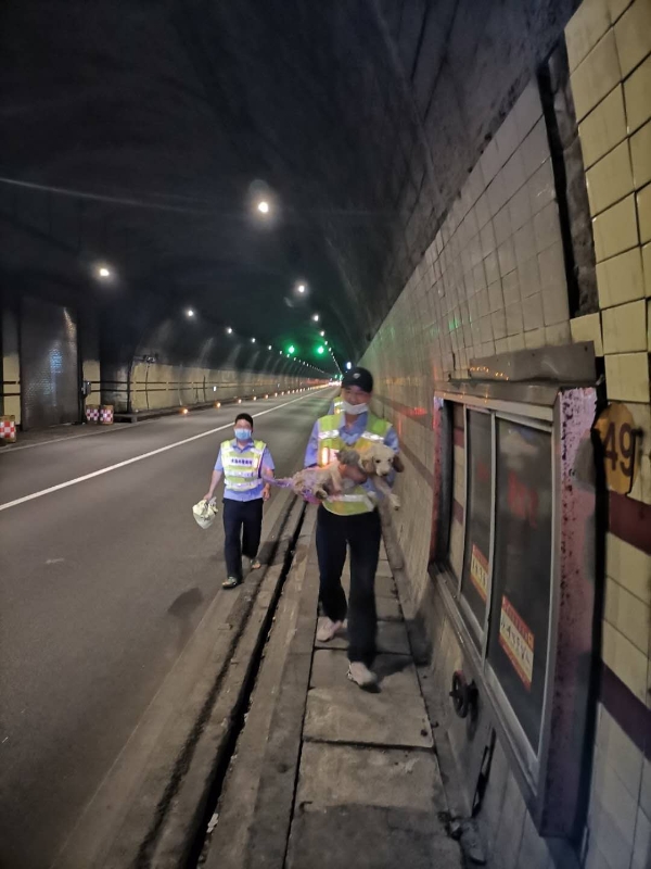 為確保安全,執(zhí)勤隊員們帶上手套,拿著掃把和麻袋,到達現(xiàn)場后發(fā)現(xiàn)是一只白色的拉布拉多犬,它一動不動地趴著,可憐巴巴地看著隧道里的車子極速而過,很顯然小狗感覺到害怕,知道趴在這里才是最安全的。隧道所安保人員陶文輝再三確認小狗沒有攻擊意圖后,試著慢慢靠近它,給它喂食香腸,并耐心安撫,直至順利地將其抱起,帶上了巡邏車。狗是靈性的動物,認準了第一個抱起它的陶文輝,乖乖地依偎在他的懷里。 此前,隧道里從未出現(xiàn)寵物狗被遺忘的事,執(zhí)勤隊長忙回到監(jiān)控室查看錄像,準備幫它尋找主人,經(jīng)過仔細查找終于發(fā)現(xiàn)隧道里有過一次大堵車,小狗就是那個時候被主人遺忘的。按照時間推算,這條小狗已經(jīng)在隧道里呆了近14個小時,還好它聰明,趴在那兒一動不動沒有到處亂跑。最后經(jīng)過半個多小時的查找,隊長終于與車主取得聯(lián)系,晚上22點左右,車主來到大溪嶺隧道所認領(lǐng),多次感謝我們對小狗的救援和照顧。 孫鵬