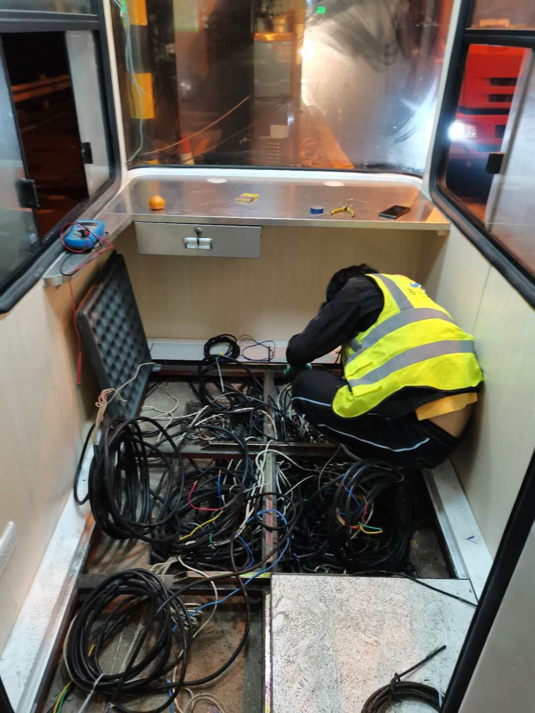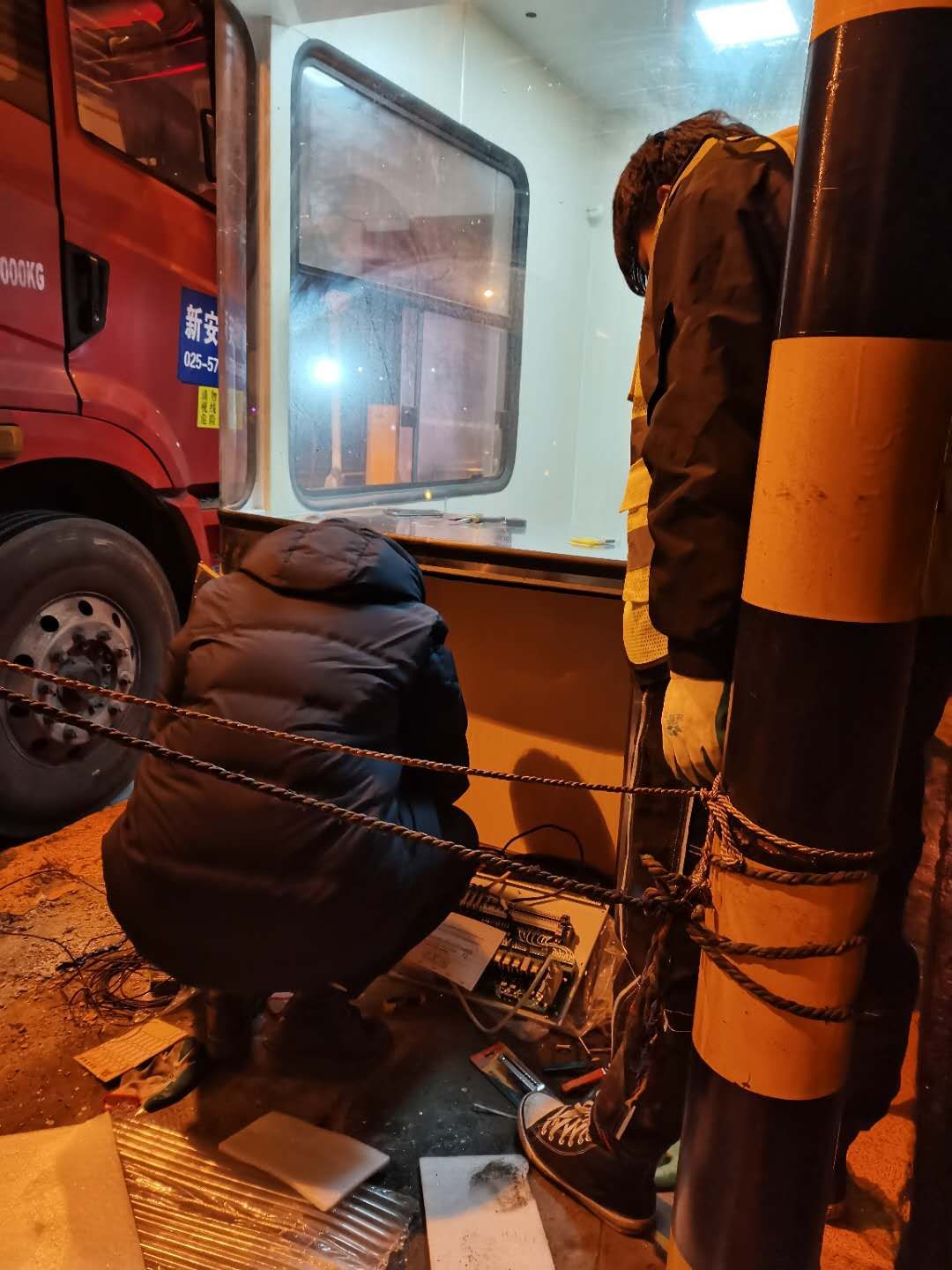 21日下午4點(diǎn)左右,訂購的新崗?fù)ず蛽p壞的設(shè)備設(shè)施陸續(xù)到位,中心值班人員協(xié)同設(shè)備廠家一起將其安放并固定至車道原位置。因崗?fù)A倒時(shí)拉斷了底下很多線纜,在拆除設(shè)備時(shí)又因?yàn)榫o急搶修需要沒有作相應(yīng)標(biāo)注,現(xiàn)場各種電線接頭雜亂如麻??紤]到夜間查線、接線存在一定的安全隱患,也不利于施工,搶修人員決定第二天再戰(zhàn)。