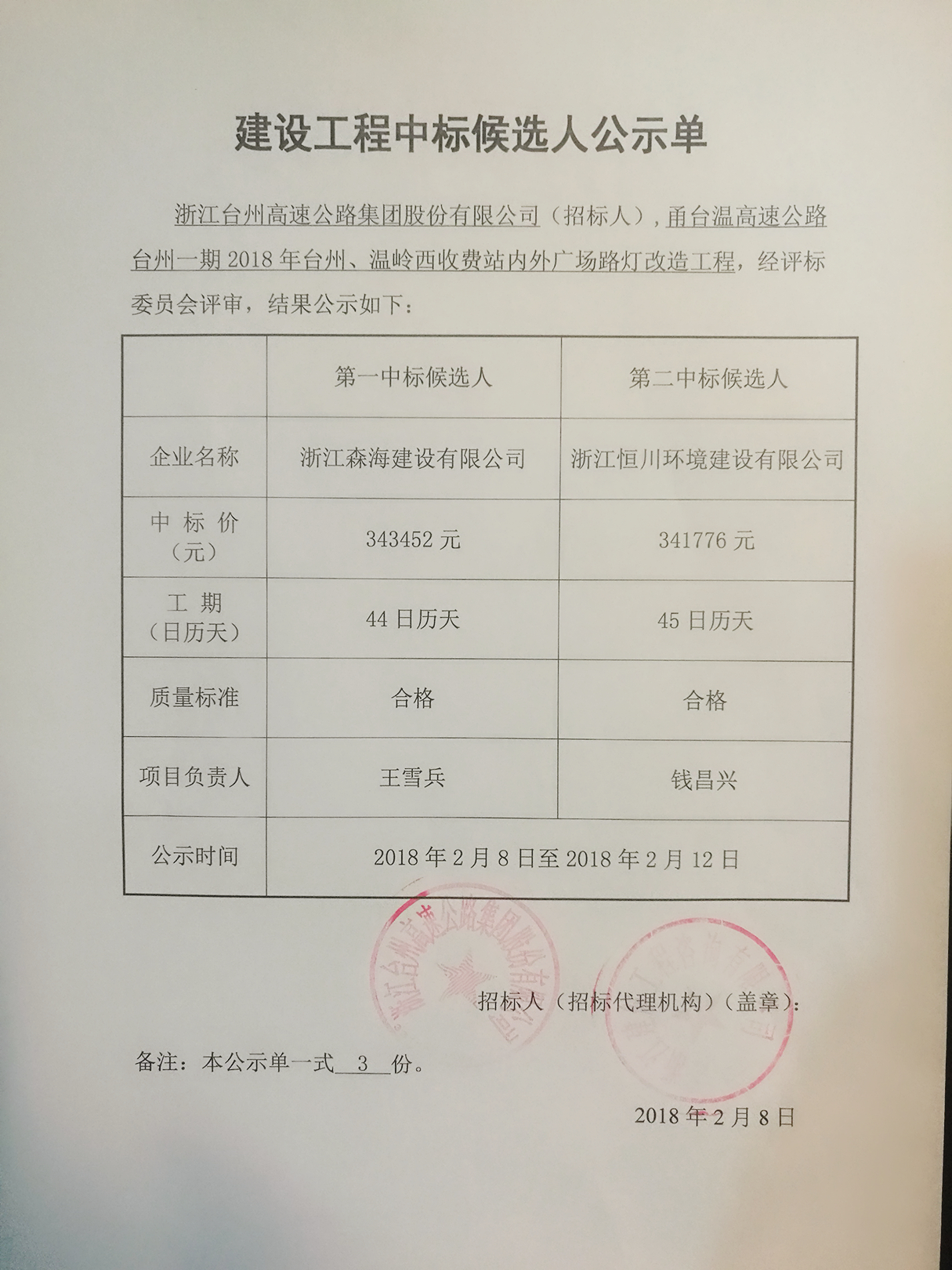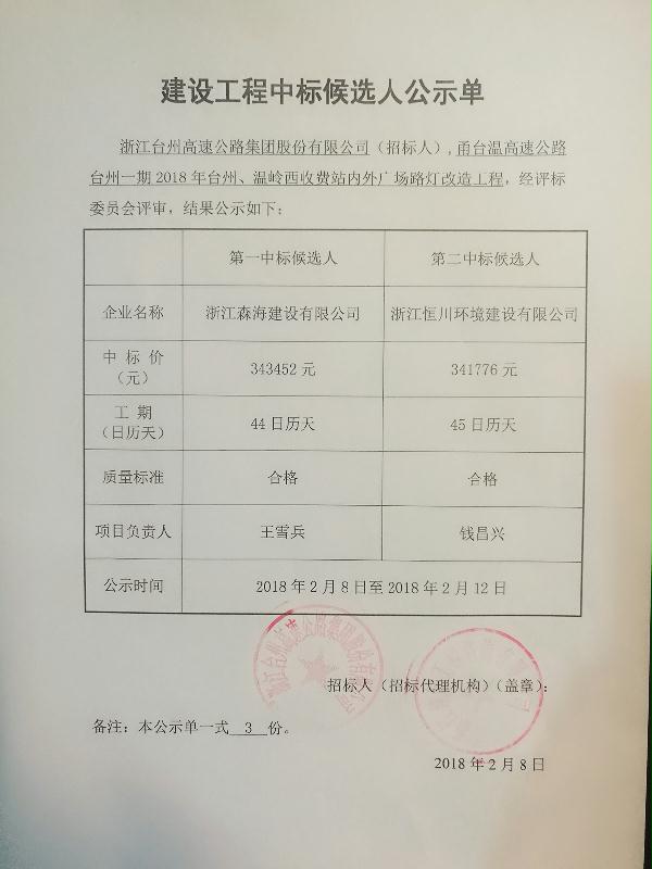 2018年臺(tái)州、溫嶺西收費(fèi)站內(nèi)外廣場路燈改造工程中標(biāo)候選人公示單