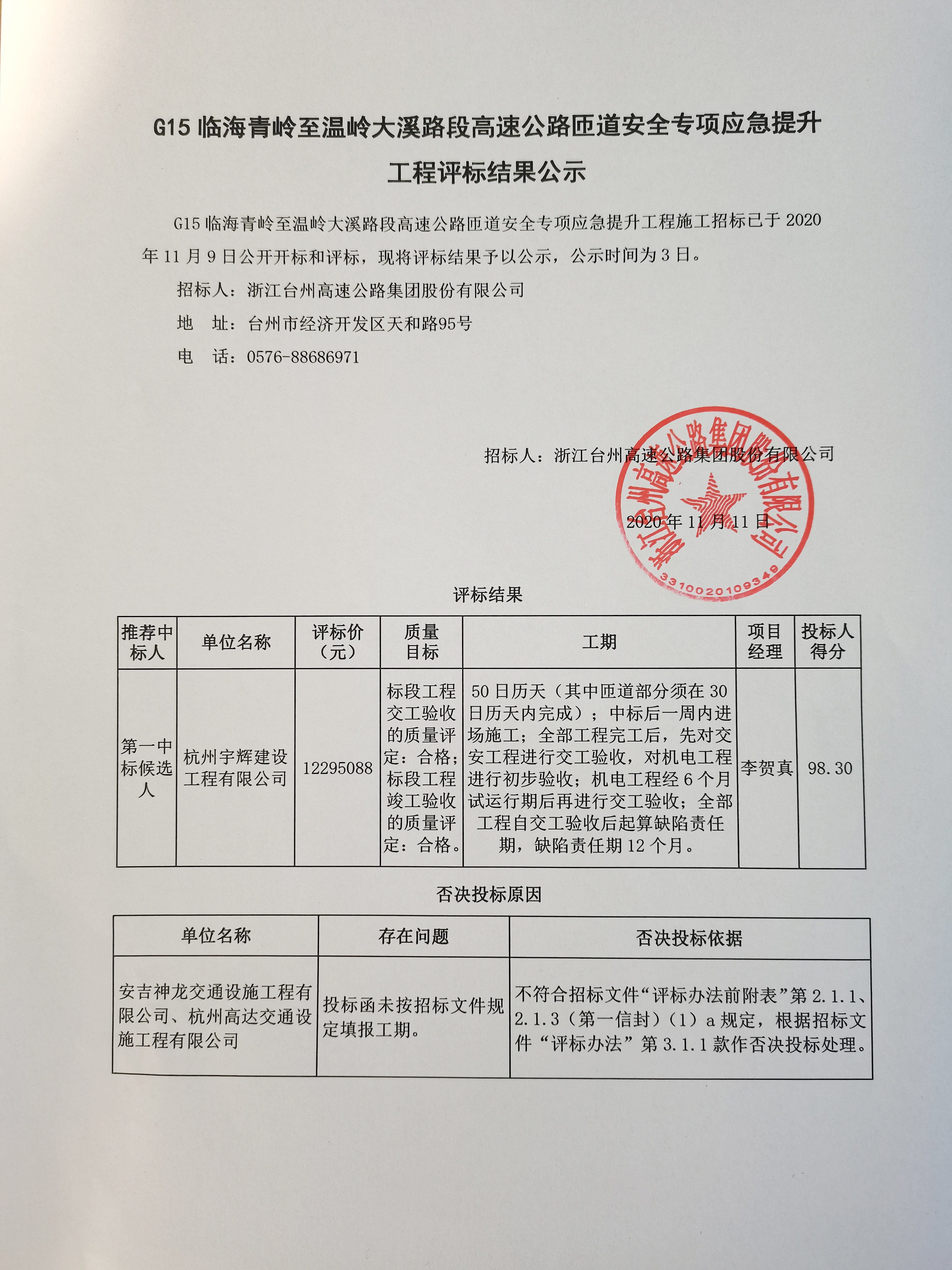 G15臨海青嶺至溫嶺大溪路段高速公路匝道安全專項(xiàng)應(yīng)急提升工程評標(biāo)結(jié)果公示