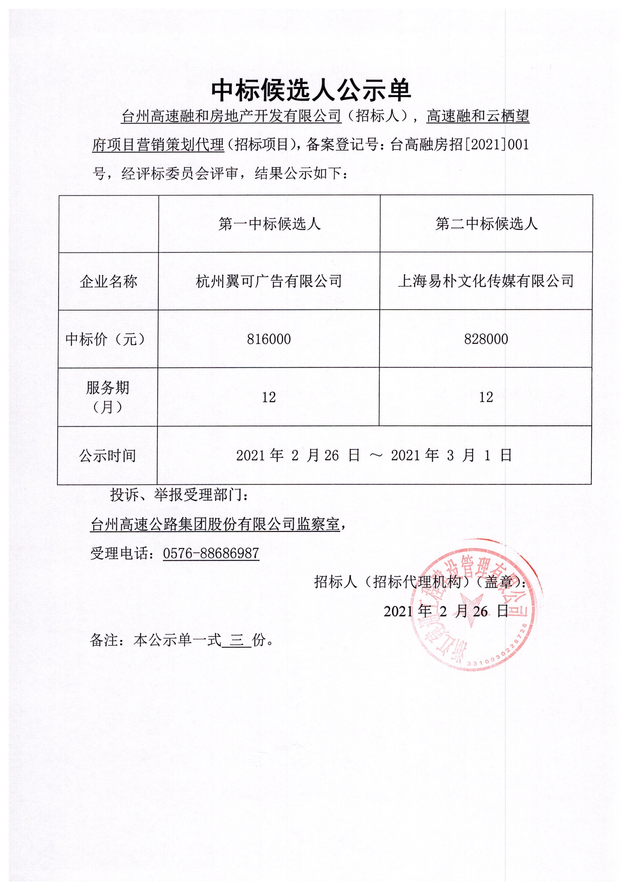 高速融和云棲望府項(xiàng)目營(yíng)銷策劃代理中標(biāo)候選人公示